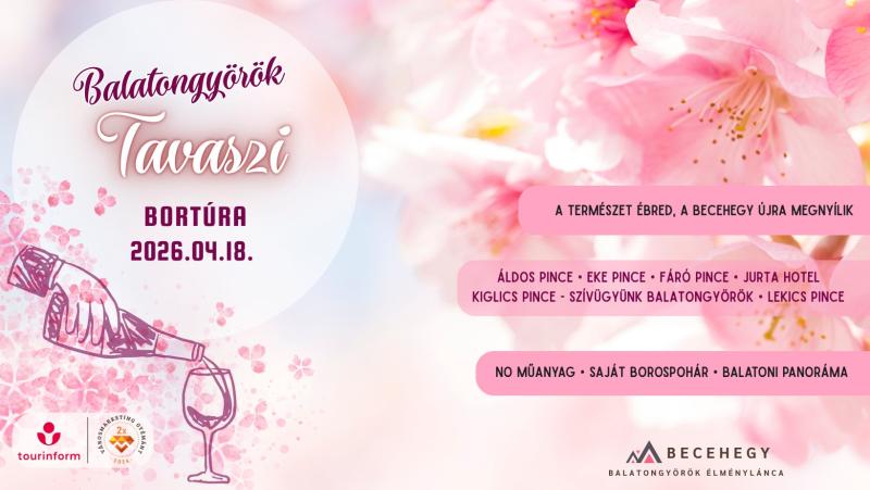 ÚJ IDŐPONT! A Tavaszi Becehegyi Bortúra a balatongyöröki bortúrák sorozatának első állomása, amikor a szőlőhegy újra megtelik élettel, a pincék kitárják kapuikat, és a vendégek személyesen találkozhatnak a helyi borászokkal.