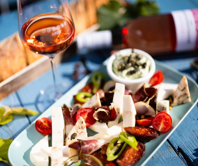 A kóstoló mellé finom vegyes hidegtál érkezik – helyi kolbásszal, sonkával, kézműves sajtokkal, szőlőmag olajjal, friss zöldségekkel és paillasse kenyérrel.