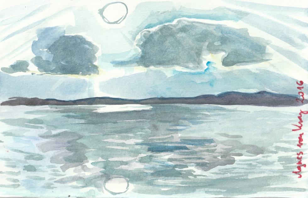 A kiállítás kis méretű plein air akvarellek alapján megfestett olajképekből áll. A Balatonnál készülnek. A pillanat levegősségét rögzítik, a fény mozgását, színeit. Ehhez párosulnak a figuratív ’jegyzetek’, rajzok. A kettő összeolvadásából születik az olajfestmény.