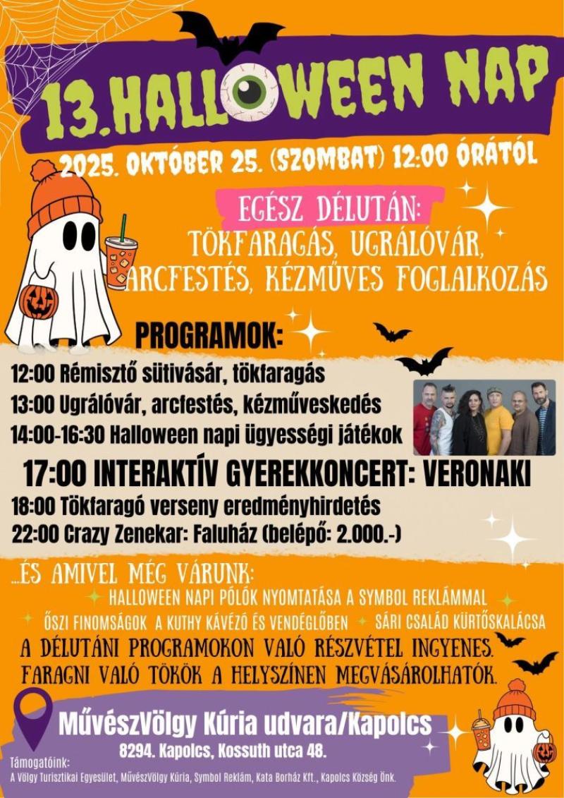 Készülj a borzongatóan vidám napra – jön a 13. Halloween Nap Kapolcson! Egész délután tökfaragás, ugrálóvár, arcfestés és kézműveskedés vár – igazi halloween-i hangulatban!