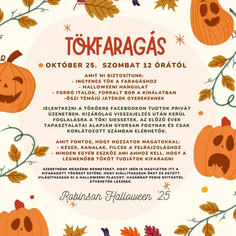 Készülj fel a legkreatívabb őszi mókára – jön a Tökfaragás a Robinsonban, október 25-én, szombaton 12 órától! Ingyenes tökök, forró italok, forralt bor és igazi halloweeni hangulat vár minden korosztályt.