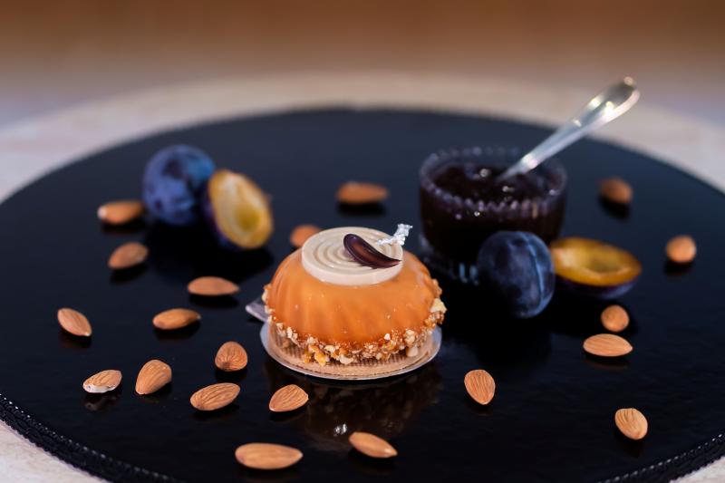 A nyertes junior desszert a szilva gazdag ízvilágát és a mandula finom eleganciáját ötvözi. A pálinkás szilvazselé és a mandulamousse rétegeit fahéjas linzer és roppanós grillázs egészíti ki, a karamellás bevonat és az aranyfényű díszítés a Balaton partjának különleges kincseit idézi. Egy desszert, amely egyszerre letisztult és ünnepi.