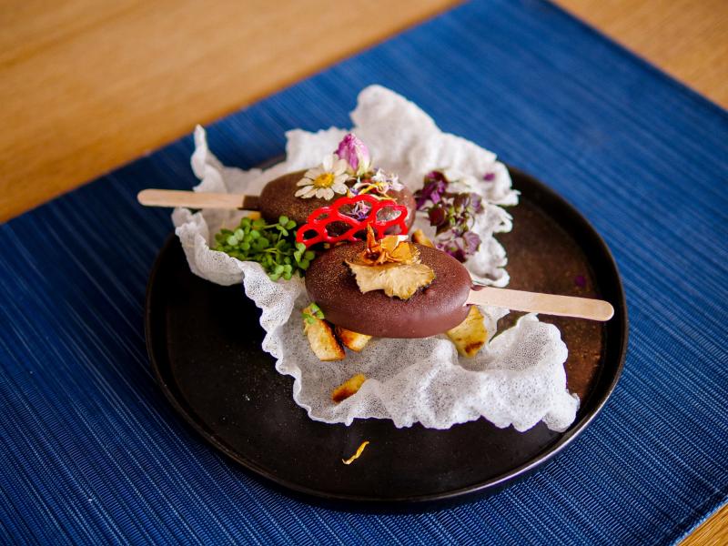 Tilia Badacsony: Páros menü, mert a szerelmesek egy tányérból esznek. A tányér Női szemmel: rozé kacsamell, levendulás méz, zeller, almakrém, pirított mogyoró; Férfi szemmel: ropogós malac császár, vörösboros meggy, polenta