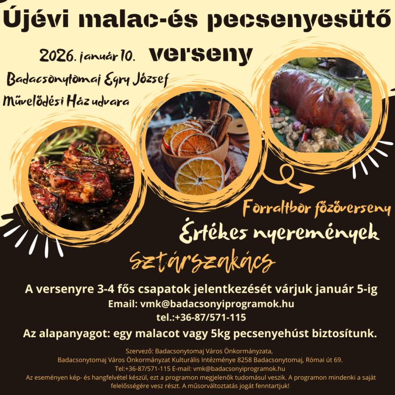 2026. január 10-én, szombaton igazi téli gasztroünnepre várnak Badacsonytomajra: jön az Újévi malac- és pecsenyesütő verseny, ahol 3–4 fős csapatok mérhetik össze tudásukat. A szervezők a lelkes versenyzőknek az alapanyagot is biztosítják: