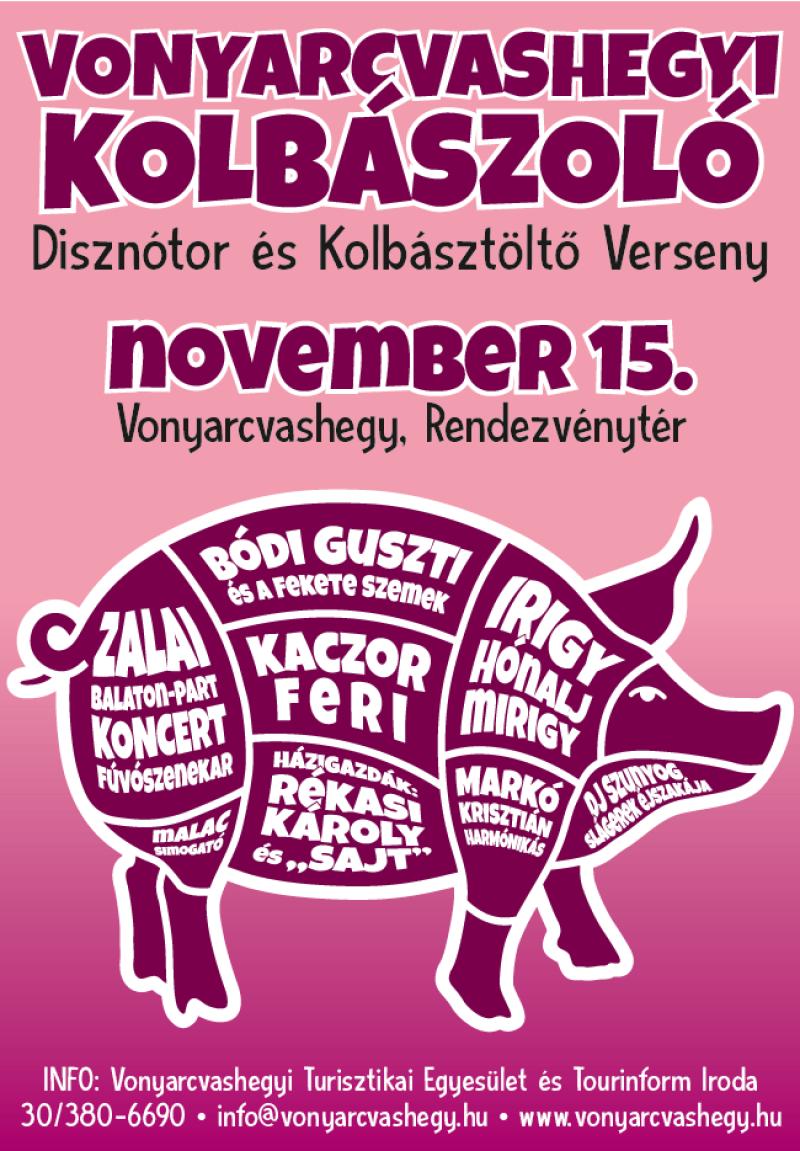November 15-én tizenhatodik alkalommal rendezik meg a Vonyarcvashegyi Kolbászolót, ahol jókedv és a finom falatok várnak rátok. A nap házi pálinkával indul, majd a régi disznóvágások hagyományait követve megnézhetitek a pörzsölést és a feldolgozás feladatait – bárki bekapcsolódhat a munkába, de semmi sem kötelező.